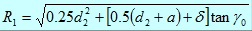 在設(shè)計(jì)錐襯套之前,進(jìn)動(dòng)角r0、主軸尺寸d1,d2、偏心軸套上平面到懸掛點(diǎn)O的距離H、直徑和高度D、H均為已知。根據(jù)下圖1所示的幾何關(guān)系可求得O點(diǎn)到錐襯套上口間隙處擺動(dòng)半徑R1值和R2值: